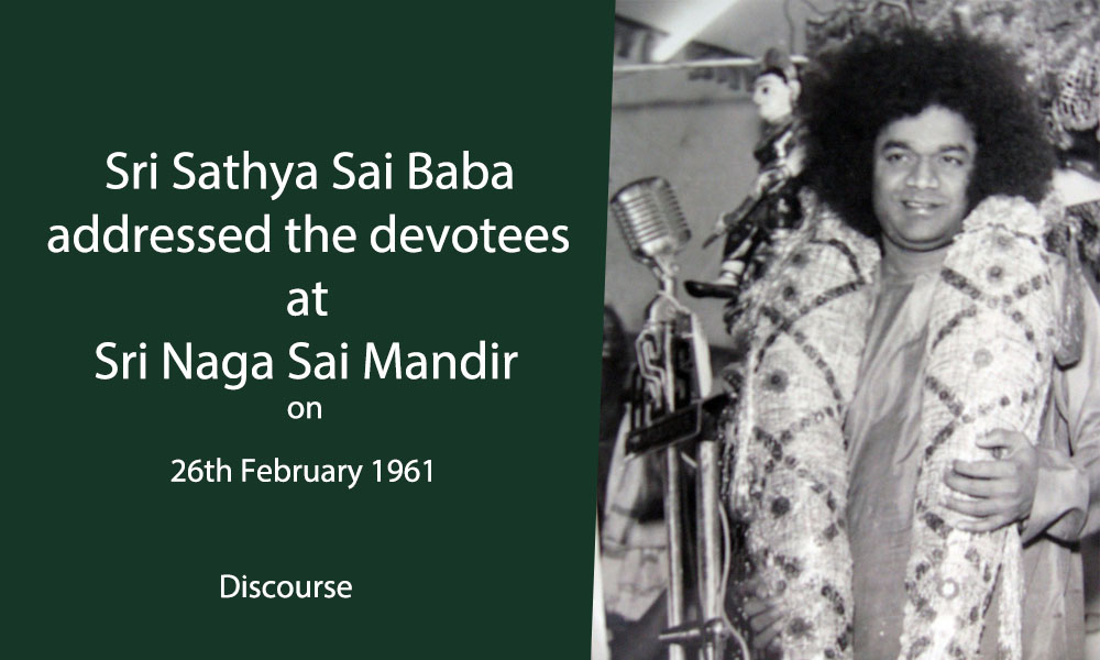 On 26th February 1961, during the Sri Naga Sai Idol Consecration Festival at the Sri Naga Sai Mandir in Coimbatore, Sri Sathya Sai Baba addressed the devotees. This discourse is recorded in Sri Sathya Sai Speaks, Volume 2 (1961–62).